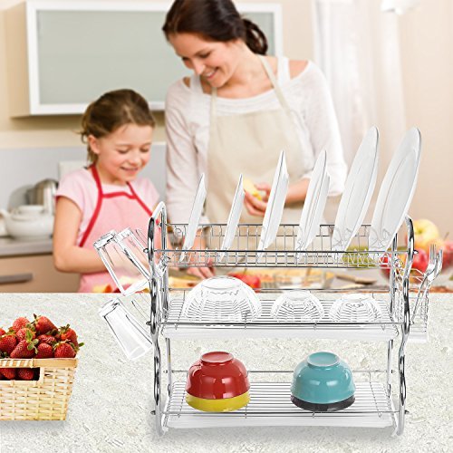 Cet égouttoir en acier inoxydable à 2 étages est bien organisé et pratique avec son bac amovible :